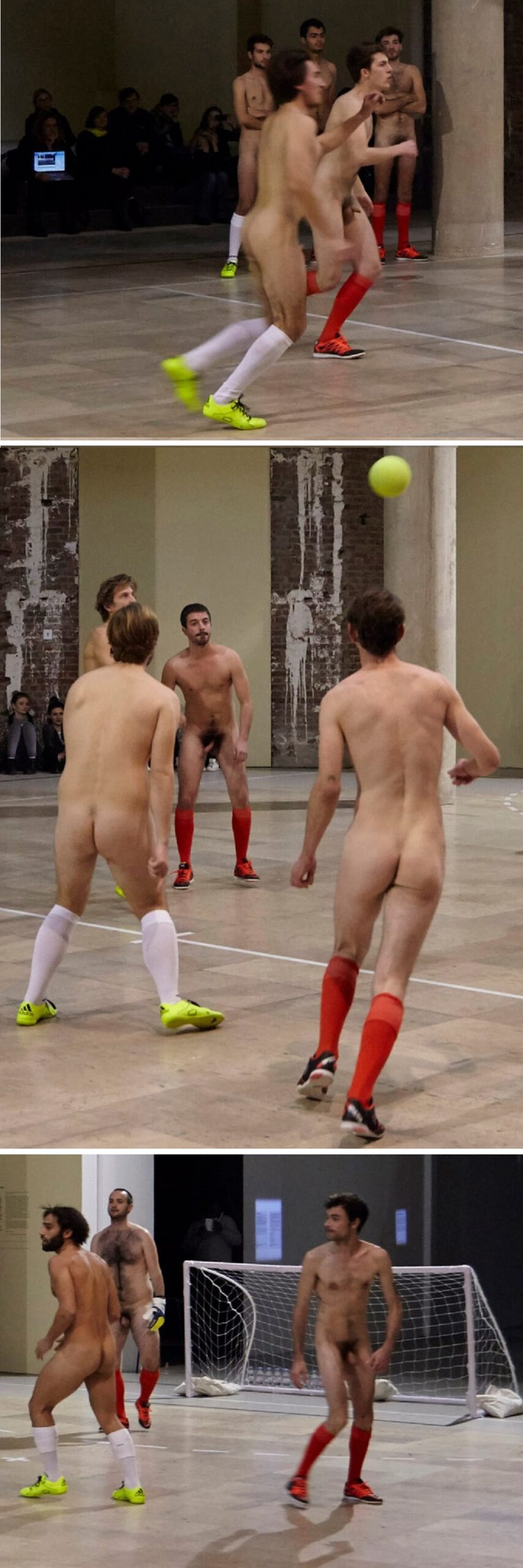 “The performance is a five-a-side football match played ‘seriously’ and competitively, the difference being that it takes place in a gallery context and all players are entirely nude, except for the socks and trainers that distinguish their teams.”