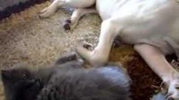 This little gray cat must have taken his crazy pill right before this video was shot. Watch him lick the dog’s eyeball! Watch the end…