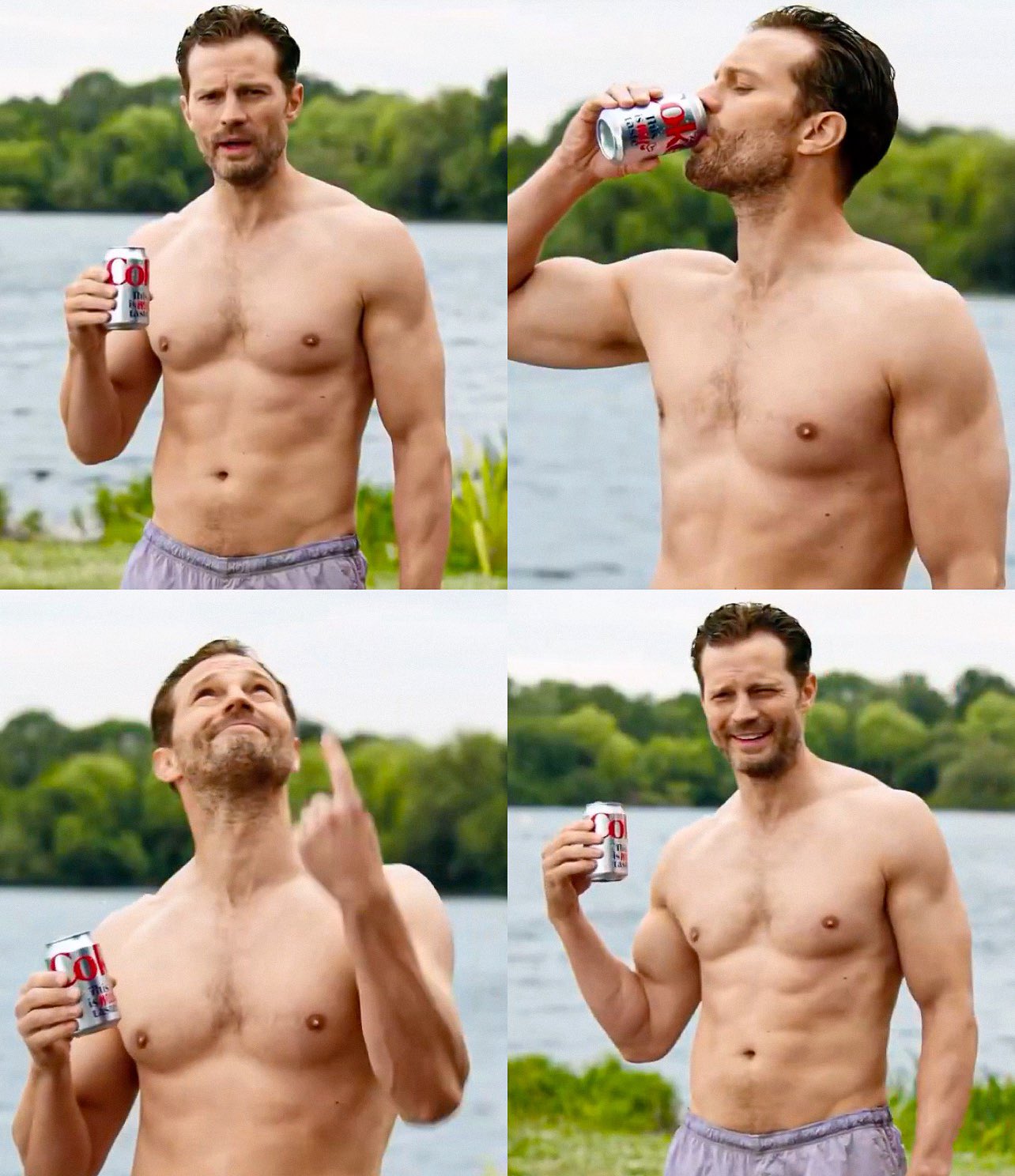 A HEAT WAVE IS UPON US! Dornan, 43, strips down to grey swimming trunks, displays a Diet Coke can, and plunges into the icy lake waters.
