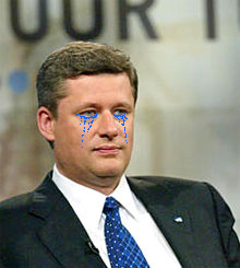 BREAKING: !! omg blog !! just got a hold of this exclusive photo of conservative Canadian Prime Minister Stephen Harper crying like a little girl following yesterday’s resounding defeat of his effort to reopen the gay marriage debate in Parliament. It must be hard when even members of your own party don’t toe the line on your regressive agenda.