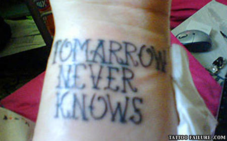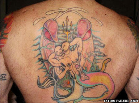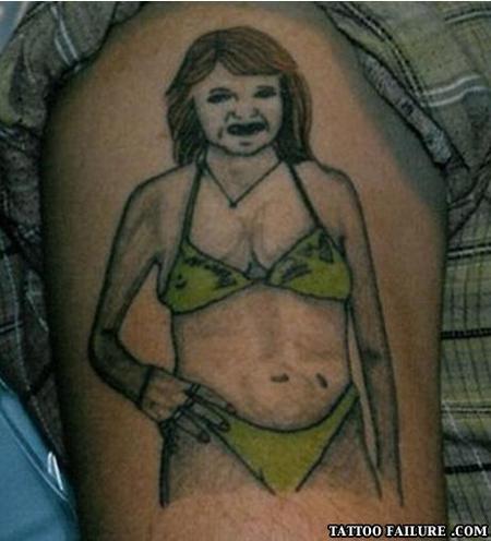 I once knew this girl named Amber who had a giant Tweety Bird tattoo on her inner thigh. She was always hiking her skirt up to show it to people. One time I asked her why Tweety Bird, and she was like, “I just LOVE Tweety Bird.” Well that’s a great reason! I keep expecting to come across the familiar vista of Amber’s thigh on Tattoo Failure, but so far no dice. I’m going to keep looking, but in the meantime I’m posting some of my favorite totally shitty tattoos here. More after the jump.