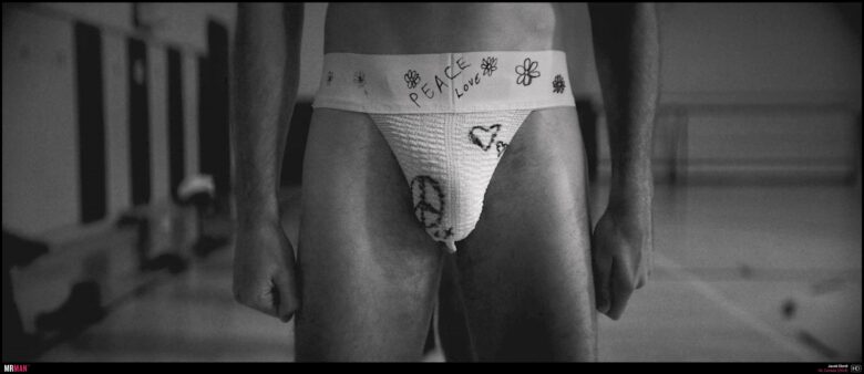 What’s the best way to protest the draft? By showing up to your military physical in a jockstrap scrawled with anti-war sentiment. All 6’ 5” of Jacob is poured into this flower power jockstrap. We also see Jacob Elordi nude during a sex scene, but we must warn you that it is of the straight variety.