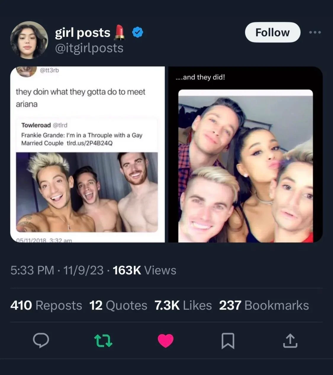 !! OMG, Ariana shows her support for brother Frankie’s poly throuple !! » Posted By Igor On Tuesday, September 10, 2024 | category: Celebs | 2 comments LOL. That caption! Oop. » share: