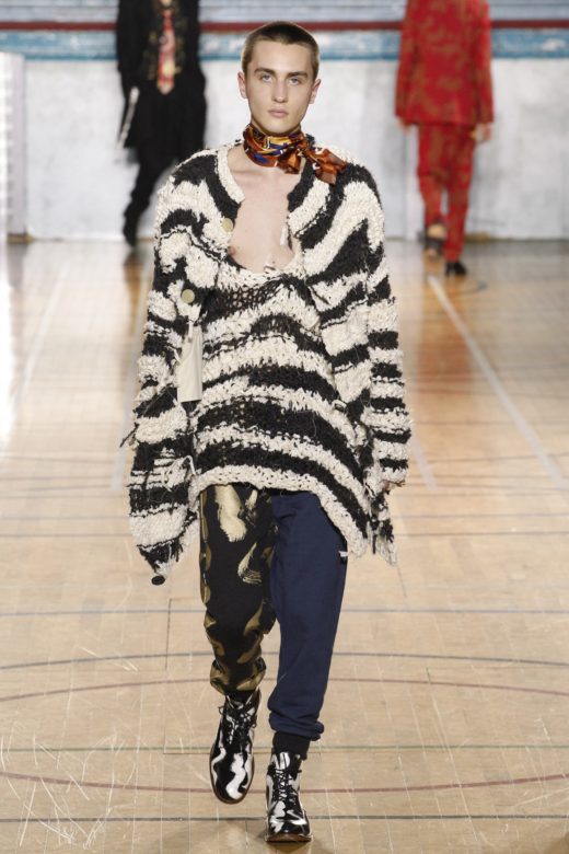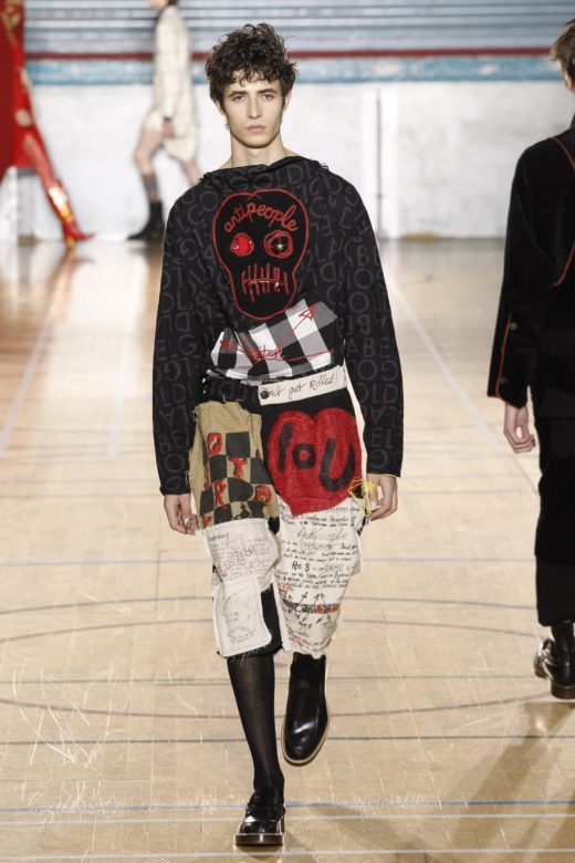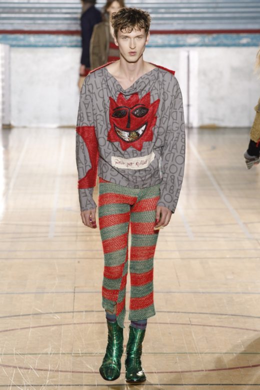For the Fall/Winter 2017 season, Vivienne Westwood decided to show during London men’s fashion week for the first time. There were male and female models in the show, but we want to highlight our favourite guys wearing key pieces like miniskirts under oversized blazers, chunky gnome knits, shimmering graphic “anti-people” tops, headpieces made from arrows, and of course a corpse bride gown.