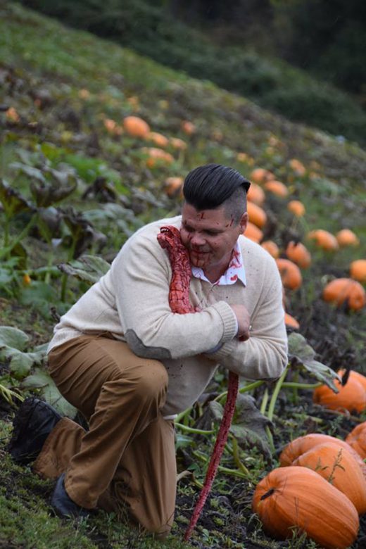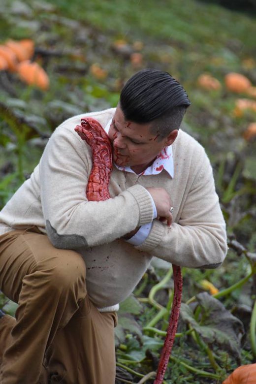 “The photo shoot took about an hour and, though chilly and muddy on the pumpkin patch, it was so much fun,” he added. “We just kept laughing at the absurdity of it and hoping the employees of the farm wouldn’t drive by to see us covered in blood.”