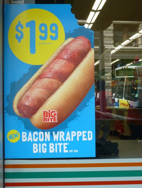 The Big Bite is a pig-wrapped-in-pig abomination that could only have been dreamed up by the food fantasists at 7-11. God bless the United States of Bacon, and kudos to Gail at the Worleygig for this find.
