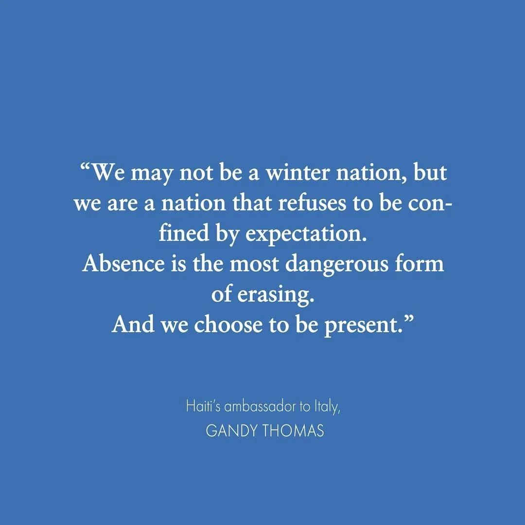 Haiti’s ambassador to Italy, Gandy Thomas, expressed in an interview with the AP. “We may not be a winter country, but we are a nation that refuses to be confined by expectation. Absence is the most dangerous form of erasing.”