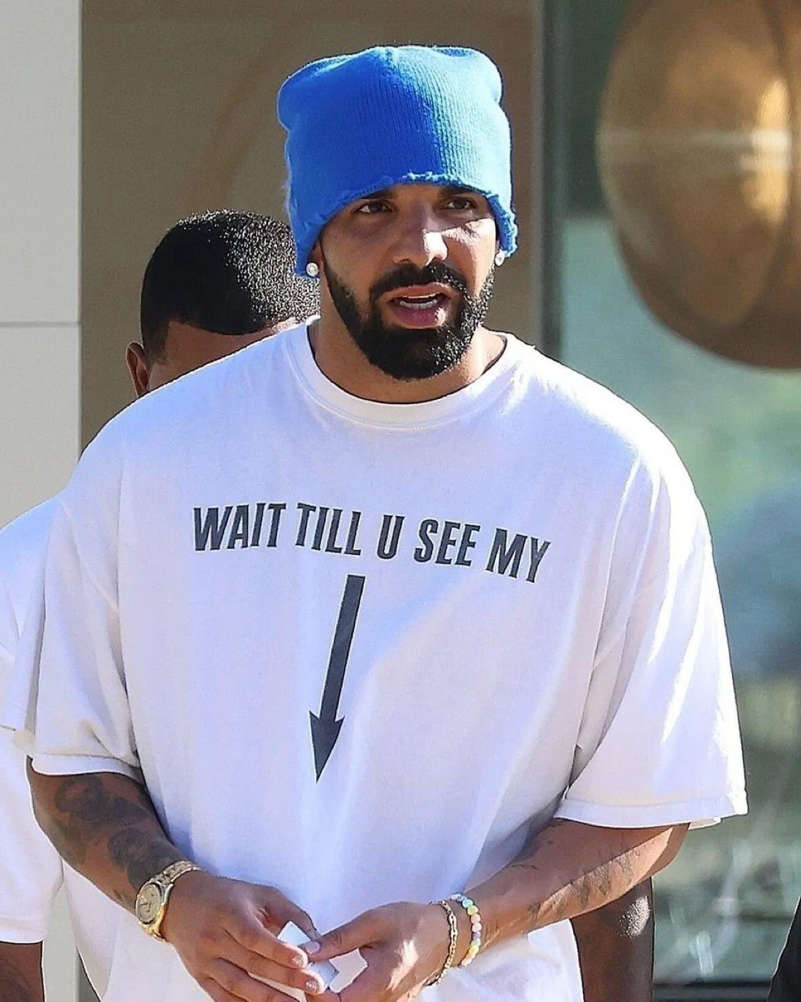 Drake turned a sassy lil look this week reminiscent of my worst days spent on AliXpress. And that’s a good thing! We love a cringey text shirt paired with blue rubber. Shop the look!