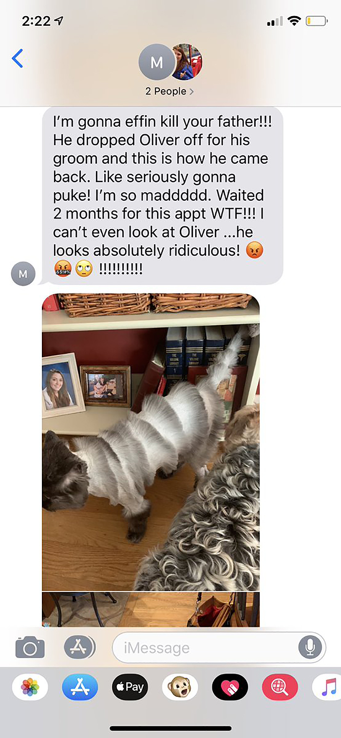 “I’m gonna effin kill your father!!! He dropped Oliver off for his groom and this is how he came back. Like seriously gonna puke! I’m so maddddd. Waited 2 months for this [appointment] WTF!!! I can’t even look at Oliver… He looks absolutely ridiculous,” the text said.