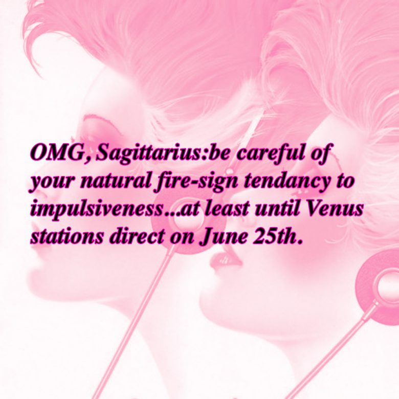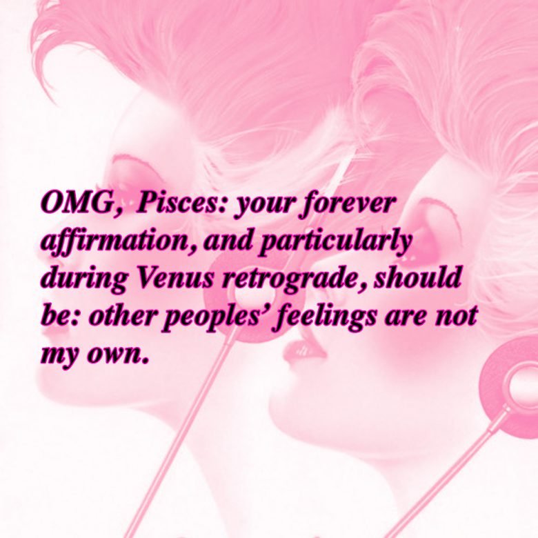 When Venus stations retrograde we go through those re-words about Venus qualities. Ex-lovers tend to re-emerge. Our money needs re-counting. We want to re-cycle our entire wardrobe. But since there is such intense energy during these times, any retrograde period is a bad time to make decisions regarding that planet’s function. Famously when Mercury stations retrograde, it’s a bad idea to make commitments or buy technology. Venus retrograde has similar qualities. Ruling Libra and the 7th house, Venus has to do with contracts – so a contract you sign during Venus retrograde might be one you find needs re-negotiating.