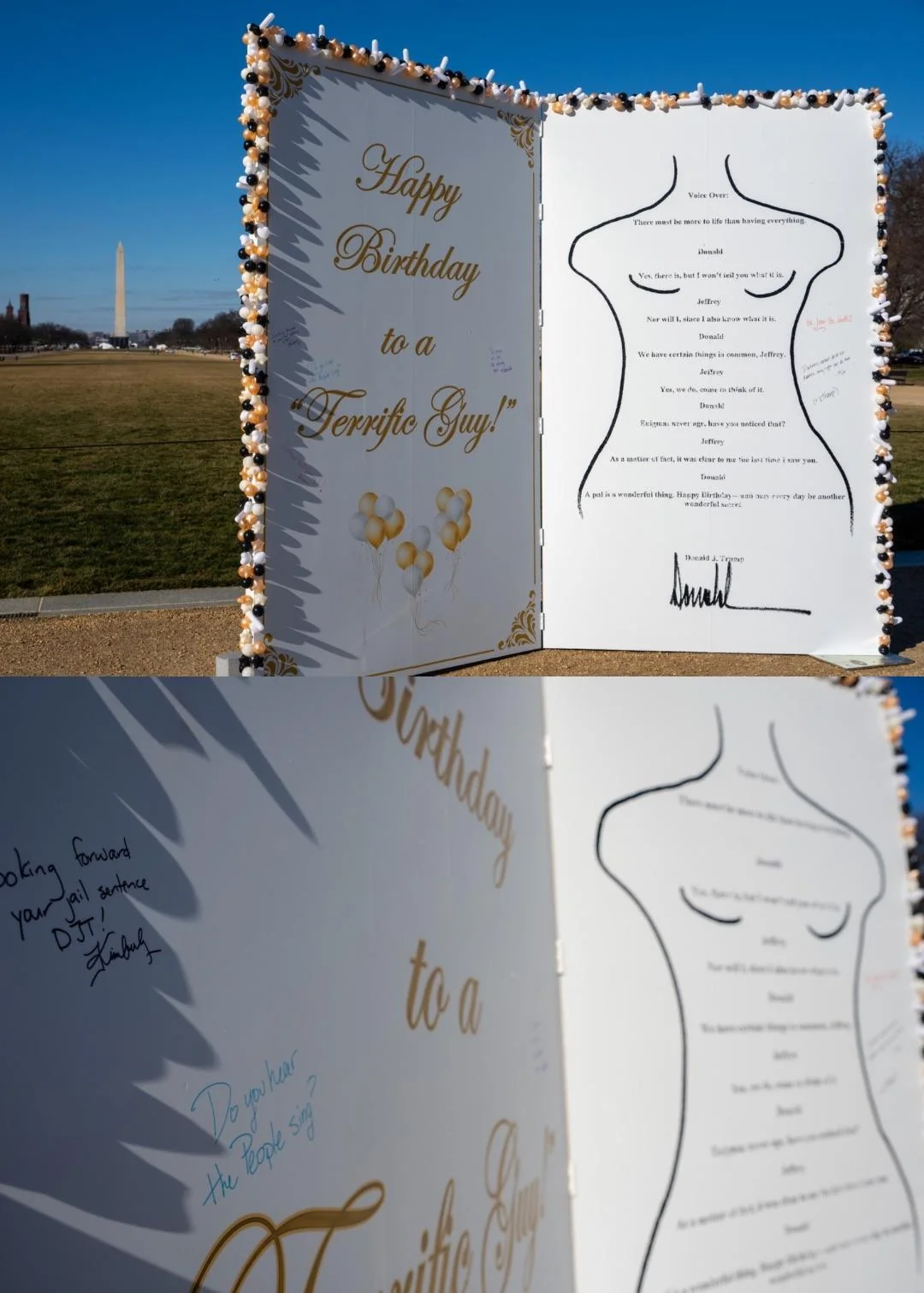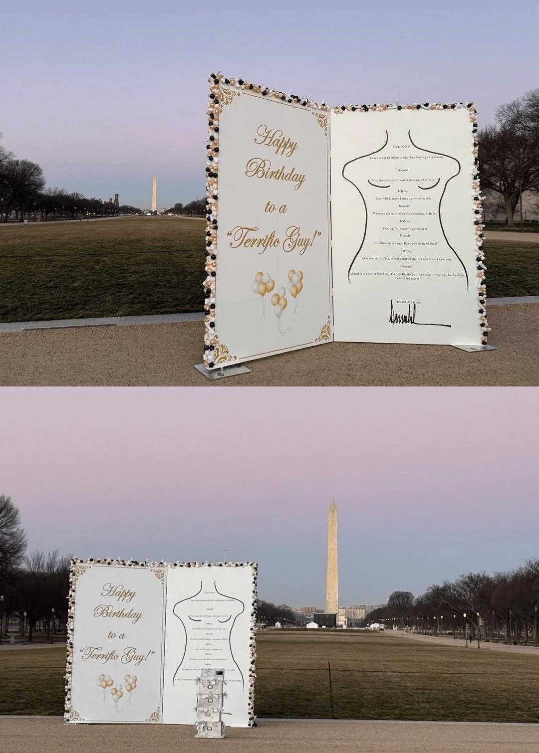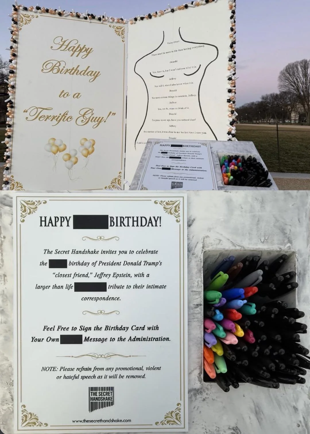 An anonymous art collective calling itself The Secret Handshake put a 10-foot replica of Donald Trump’s alleged birthday card to Jeffrey Epstein on the National Mall overnight, near the U.S. Capitol. The installation riffs on the “birthday book” note that has circulated in reporting and political documents, which Trump has denied authoring.
