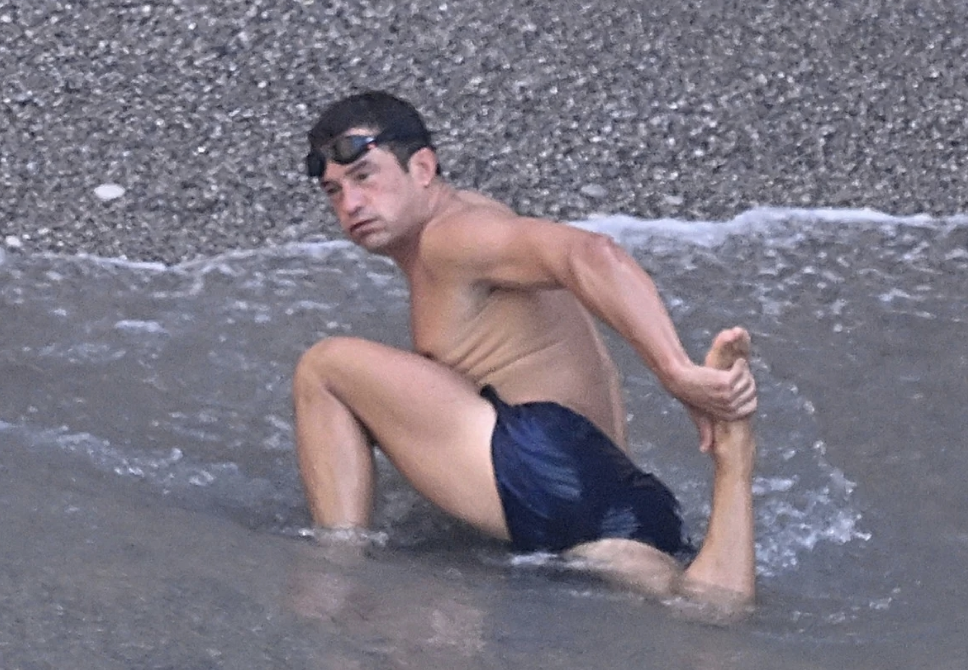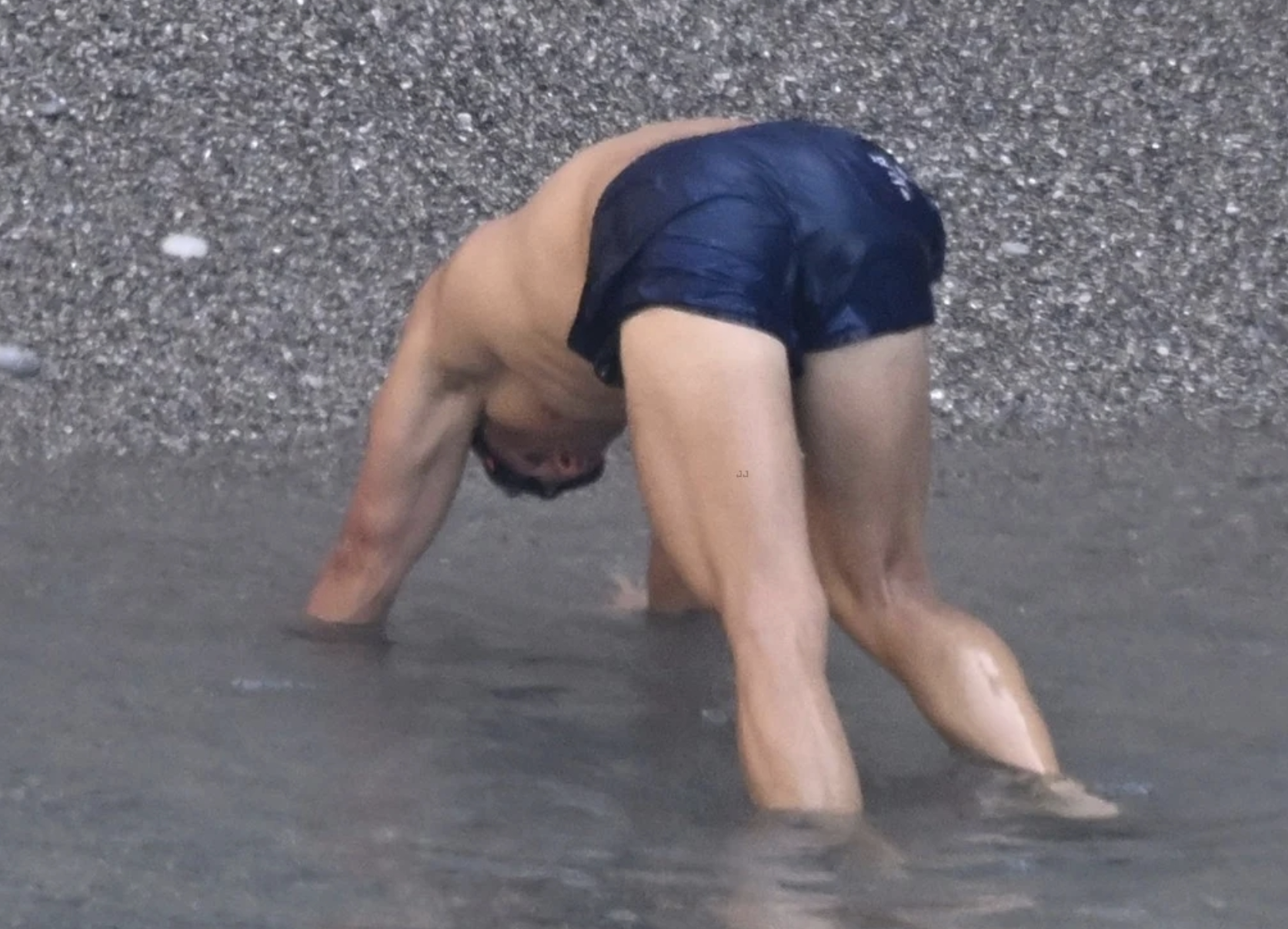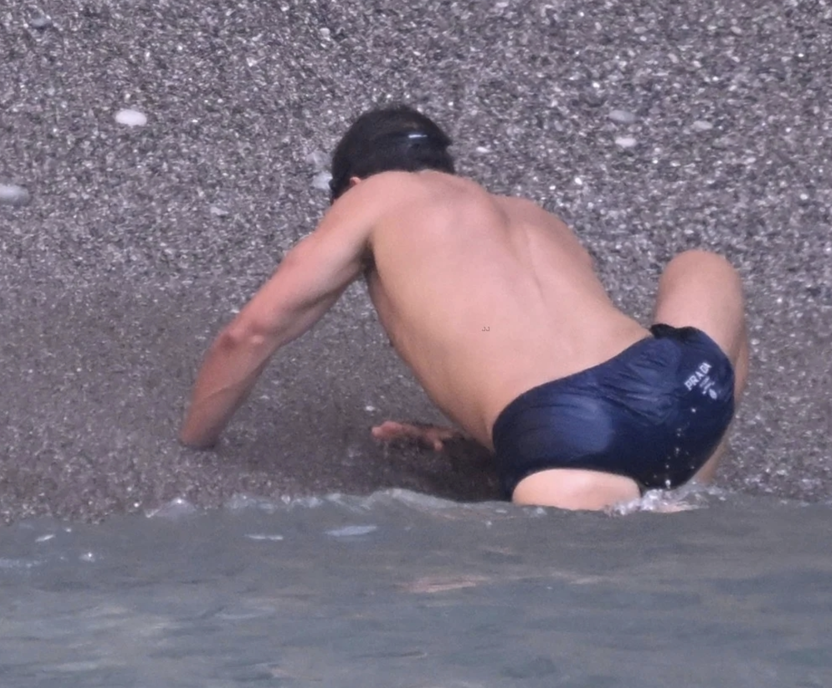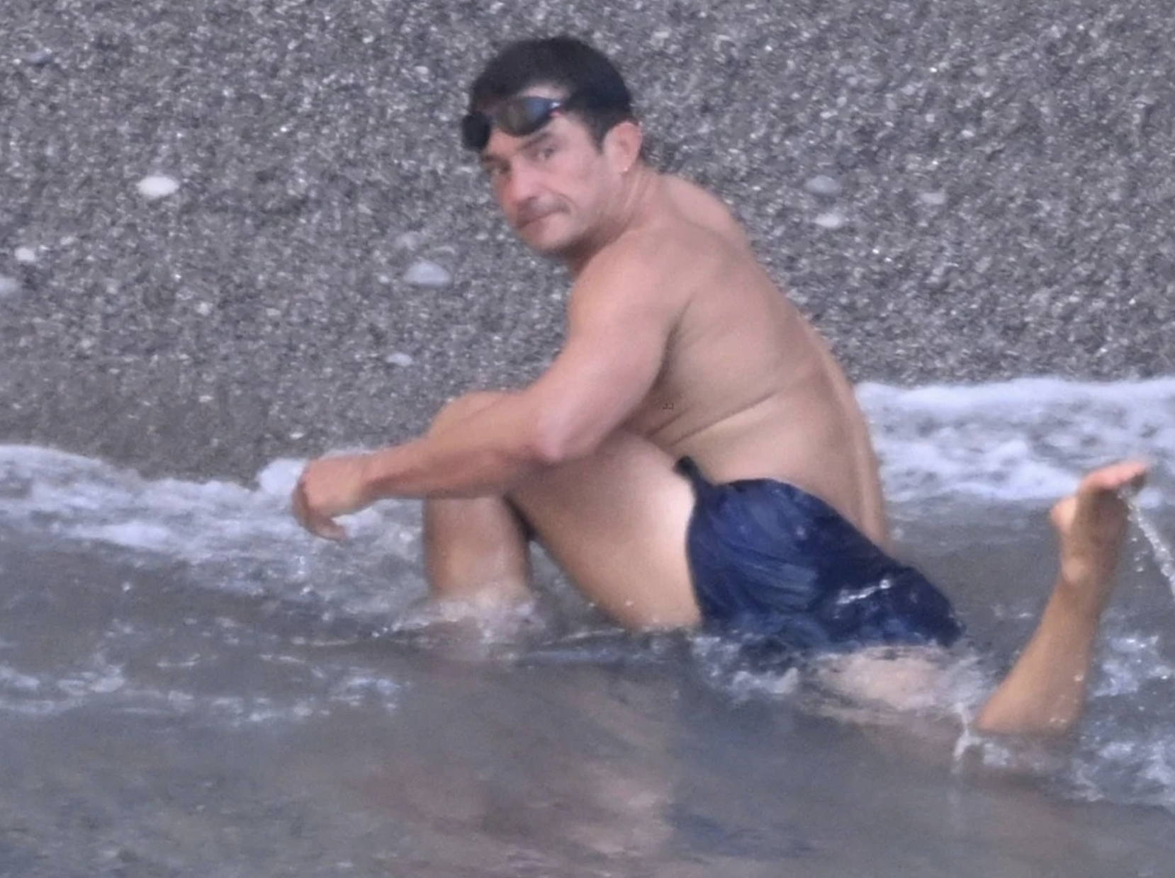 That was Mr. Katy Perry aka Orlando Bloom, this time with more clothes on and showing off how stretchy he can be on a beach in Italy with week between swims.