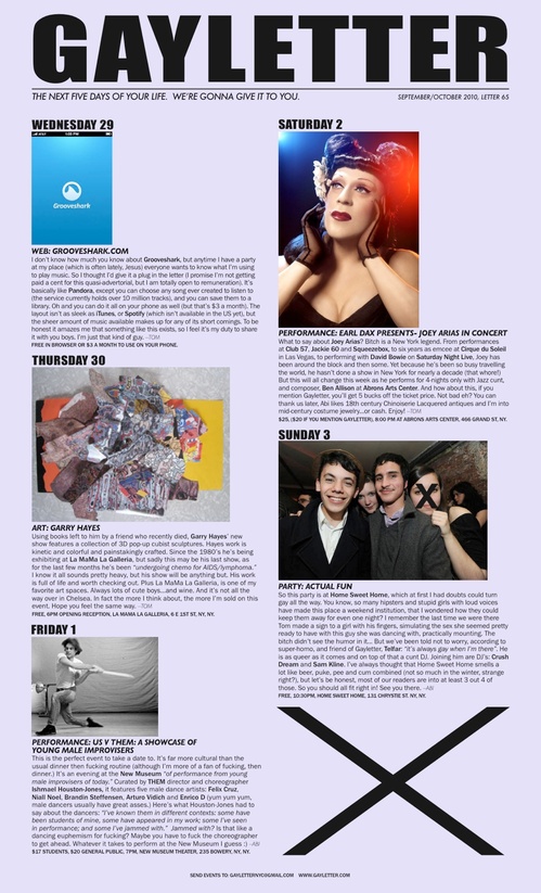Whether you’re looking for dancing, sexy times, or a little culture, you will find it (but not too much of it) in the well-edited pixels of the GAYLETTER. Paper Magazine recognized their efforts this year by nominating GAYLETTER for a Nightlife Award in the category of “best nightlife website.” You can vote for them here.