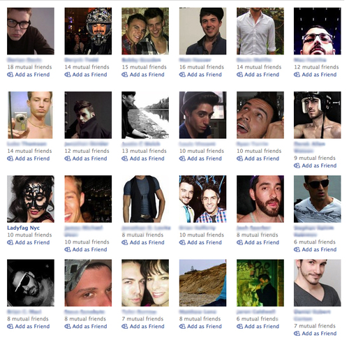Oh no. My productivity is about to go into a steep decline. I’ve discovered Facebook’s Friend Browser. Basically, it’s a tool that loads in all of your friends’ other friends and lets you narrow them down by city, school, employer, and mutual friend. So, basically, it’s a brilliant way to make your Facebook stalking more efficient. For example, I selected New York and three of my most-connected gay friends, and, BAM, hundreds of gays are a click away. Were this an actual dating tool, you’d be able to sort by gender and relationship status, but, alas, nothing in life is perfect. *Also, how awesome is it that the Friend Browser suggested I know Ladyfag?!