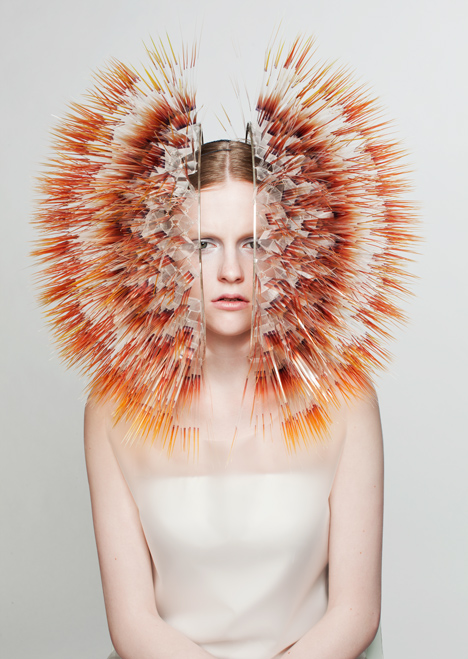 Inspired by the “futuristic mood” of Philipp Glass and Robert Wilson’s opera ‘Einstein on the Beach’, Maiko Takeda’s Royal College of Art 2013 millinery collection comprised of caterpiller-like rainbow facial fans and sea urchin-esque acrylic ‘schoodies’ and fascinators: