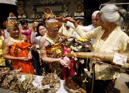 A Dutch gay couple just got gay married in Bali, and they did it in full costume! Hendricus Johannes Deijkers (left) and Christianus Huijbregts could be the first gays to wed in Bali, even though as far as I know it is not legally binding. (via Towleroad and Sticky, link NSFW)