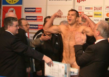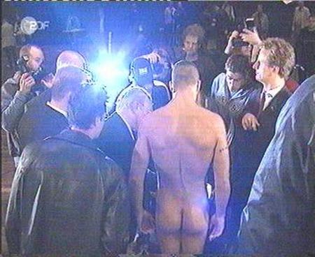 Argentinian light heavyweight boxer Hugo Hernan Garay has been enjoying the boxing match nude weigh-ins for years now. Not a shy one, he strikes a signature flexing pose and let’s the rest hang, modesty be damned.