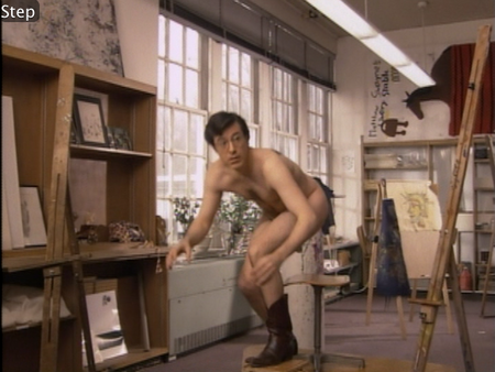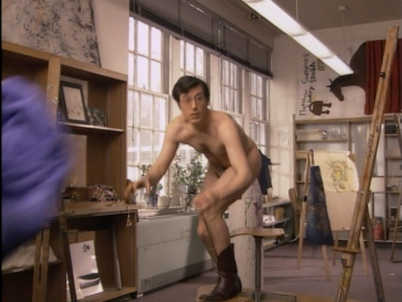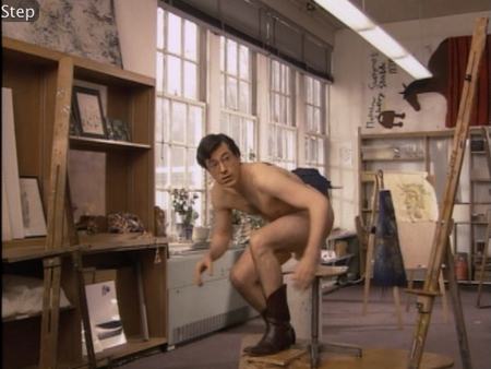Okay, so I might have drank a few Kir Royals, eaten a full bag of Clodhoppers, and fallen asleep on the couch watching the first season of Strangers with Candy on DVD…but at least because of doing that I happened upon some naked frames of comic pundit Stephen Colbert. They’re a bit blurry, but something pokes out from between Stephen’s legs when he gets up from his nude modeling pose. Check out a few NSFW frames of Colbert after the jump.