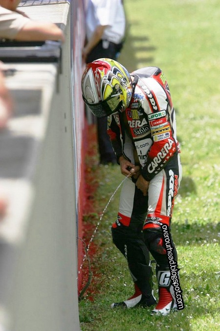 French MotoGP racer Randy de Puniet solves the eternal question of “how do racers go to the bathroom?” I’ve always wondered this because their suits seem so restrictive.