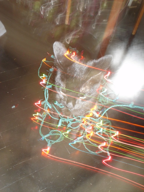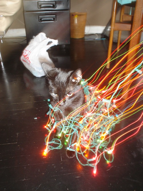 My pal, NYC-based artist Linda Griggs, sent this photo out as her Christmas card this year. It’s her grumpy cat Grappa getting pissed at the Christmas lights. Ho ho ho!