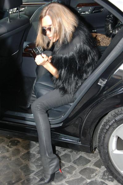 Look what Victoria Beckham wore to Tom and Katie’s wedding! It looks like monkey fur to me, but it could perhaps be alien fur to keep with the theme. See two more photos after the jump.
