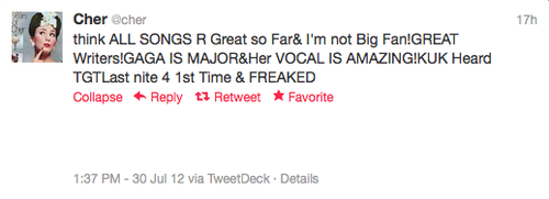 A grammatically challenged Cher took to Twitter to announce her upcoming single with Lady Gaga (out in October), along with her first album in a decade to be released closer to Christmas. “Finished Song!I LOVE IT!,” the singer later follow-up tweeted. “Cant tell names of songs cause Record CO. gave Strict ORDERS !” The wait we shall.