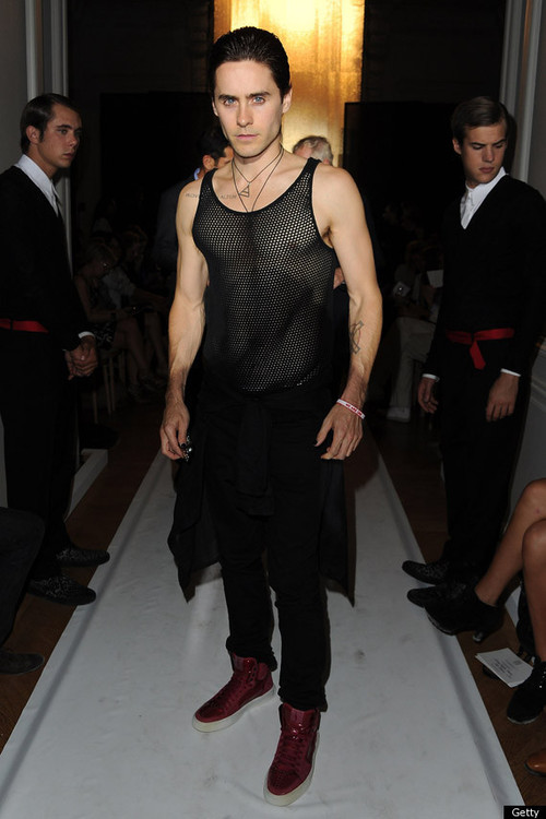 I can’t be the only one who thinks that Jared Leto is the best thing to happen to the human form, right? Here the actor-turned-musician is at the Yves Saint Laurent show for Paris Fashion Week (currently underway, oooh la la) sporting a mesh tank top. A mesh tank top on an American Gladiator cast member? Gross. A mesh tank top on Mr. Leto? Hot.