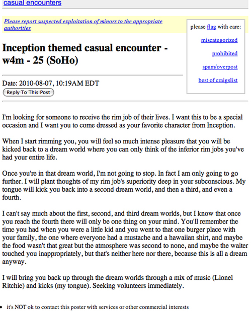 !! OMG, Only In My Dreams: Inception, the RJ !! » Posted By Bmad On Tuesday, August 10, 2010 | category: Film, Filthy, LOL | 1 comment I know this goes without saying, but this sounds at least 10 to 20 times better than the actual movie. [Via VideoGum] » share: