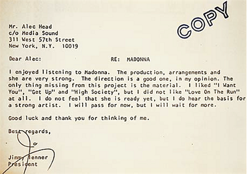 President of Millenium Records Jimmy Ienner declined to signed an up and coming artist named “Madonna” in 1981. Read his polite rejection letter above. (via AnOther)