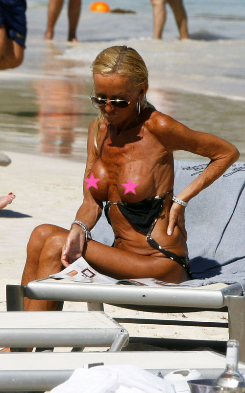 I hope you’ve already had your morning coffee, cause I have a special treat for you! It’s Donatella Versace’s bare boobs! I know a good third of you will probably vomit after seeing these images, but I personally must salute the lady Versace credit for truly not giving a f*ck. And you know what they say: you can never be too rich or too tan!