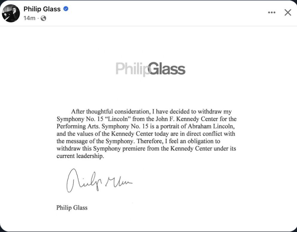 !! OMG, Philip Glass withdraws his Symphony No. 15 “Lincoln” from the John F. Kennedy Center for the Performing Arts, stating: “The values of the Kennedy Center today are in direct conflict with the message of the Symphony.” !!