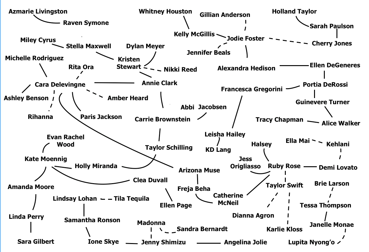 Solid lines represent dating, dotted lines represent rumors. All these couples are 100% factual and true, so don’t come for me.