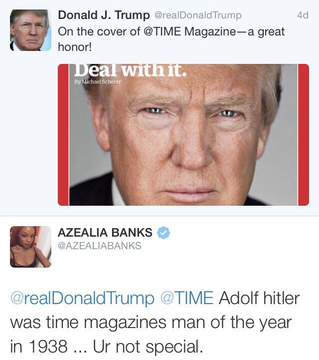 Sometimes we can’t stand Azealia Banks‘ self-involved Twitter rants, but other times.. other times she’s right on point! Like when she compared Trump to Hilter…