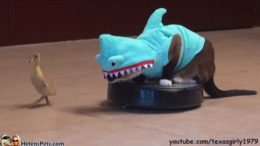 OMG, cat in sharks clothing: kitty chases ducky on auto-vac vehicle