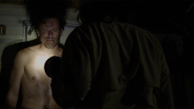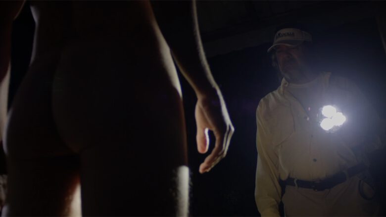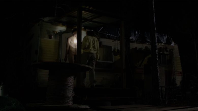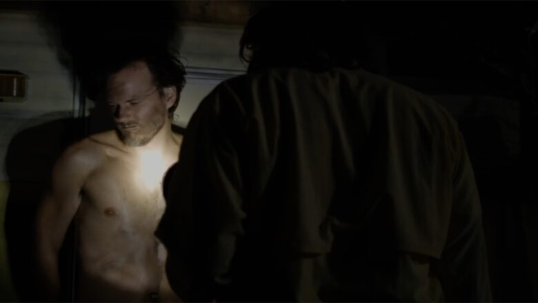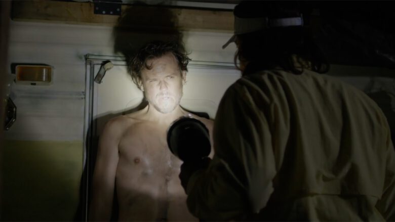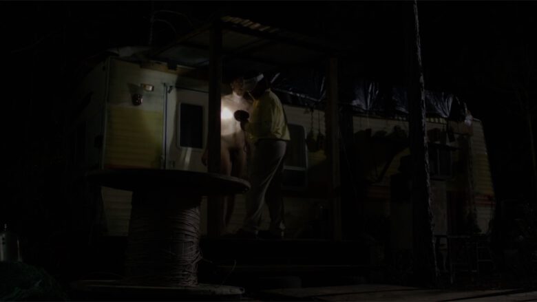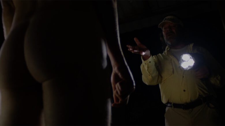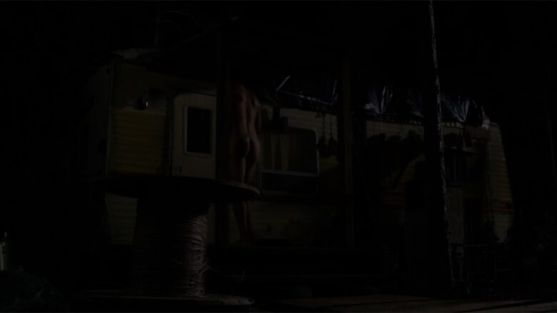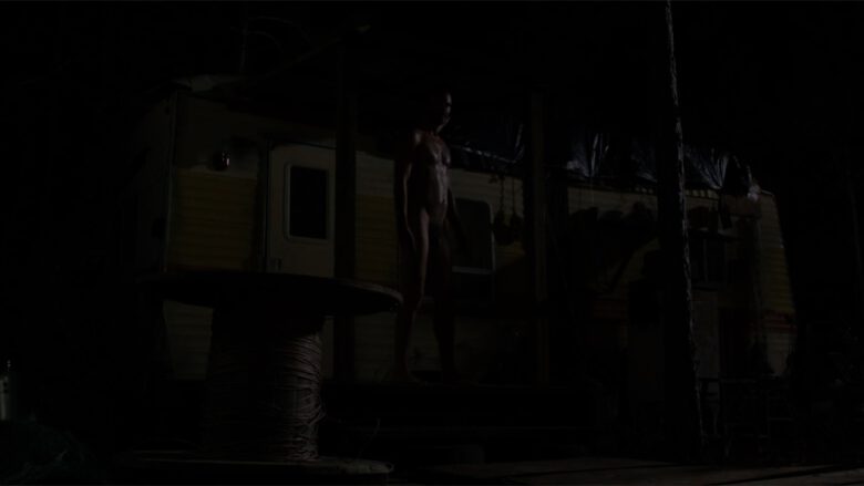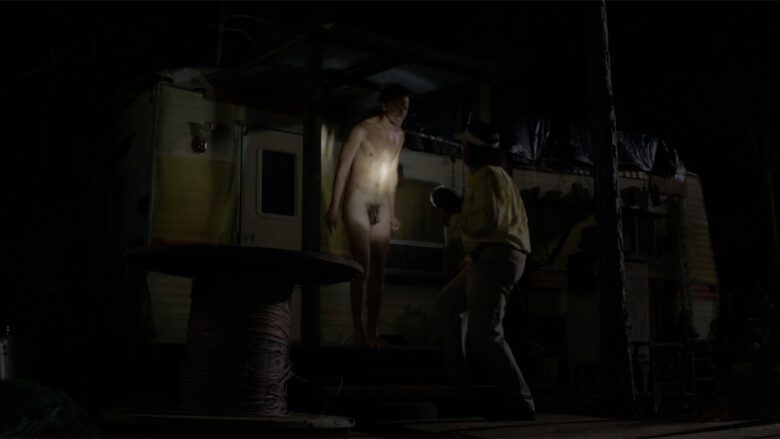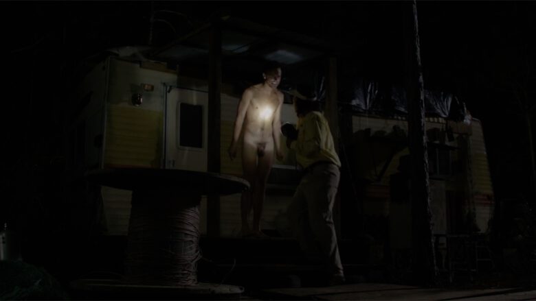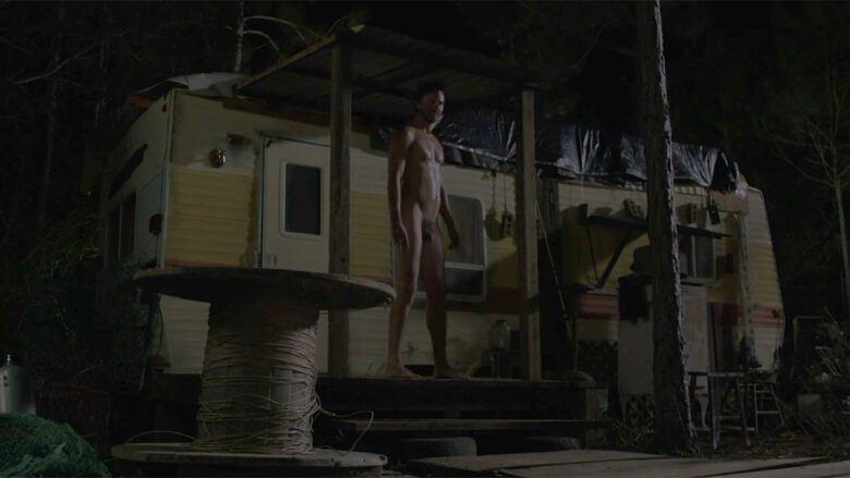 In The Immortal Jellyfish Whitmer Thomas plays “Denny, an off-the-grid oddball who calls a nurse hot-line for help with his nasty “fire piss” problem”… uh, we’ll stop right there and just show you the stills of where in the film it made sense to writer/director Dusty Bias to have Denny naked and lit by a flashlight on the porch of his trailer.